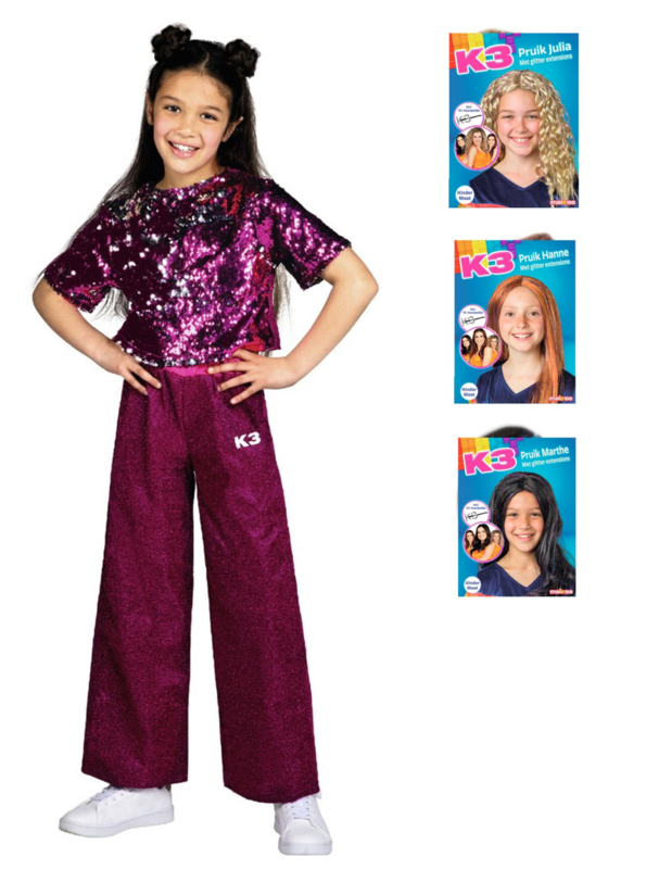 Het nieuwe K3 verkleedpak glitter! Ga verkleed als een echt K3-tje met het verkleedsetje én de bijpassende Pruik waarmee je écht verkleed gaat als Julia, Hanne of Marthe!