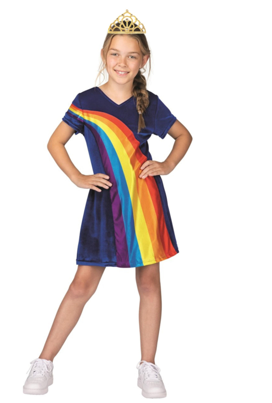 Mooi goud kleurig kroontje en gekleurde regenboog steentjes. Staat super leuk bij een K3 jurkje regenboog. Het kroontje past helemaal bling bling bij het geel uit de regenboog, steel de show!