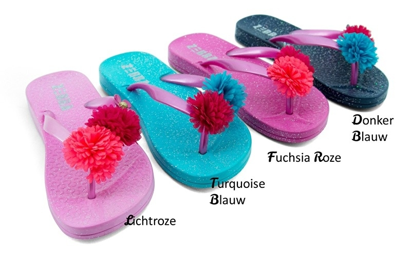 Super hippe Zebra Slippers Bloem in 4 zomerse kleuren. Op de slippers zit een mooie bloem en de bandjes zijn met glitters bewerkt!
